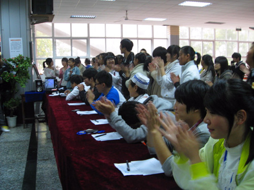 比赛尚未开始,现场气氛已十分热烈,现场“亲友团”和参赛选手已经蓄势待发,学生会工作人员在整齐排列的桌子上摆放了比赛用具。主持人裴文渊、鲁琼琼齐声宣布本次比赛开始。随后,被分为八组的选手们依次亮相。