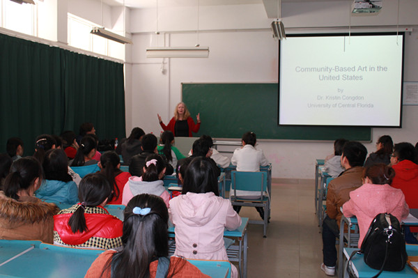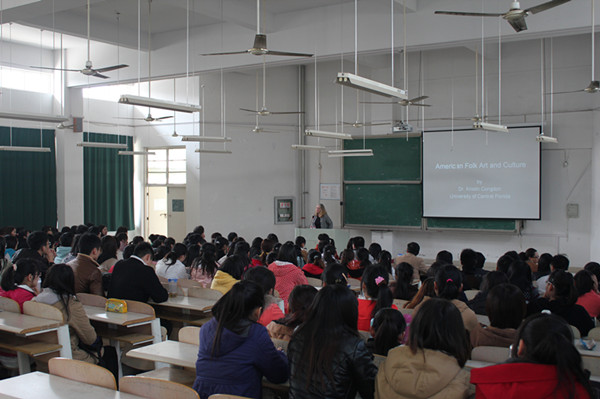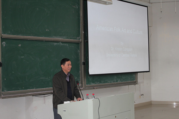 4月1日、4月2日上午,美国中佛罗里达大学人文学院Kristin Congdon教授和哲学系主任Bruce Janz教授来我校讲学,他们在西区医教303、105教室做了主题为“Amercian Folk Art and Culture”(美国民俗艺术与文化)的两场学术报告。LEJING.COM教师及英语专业2010级、2011级学生等300余人到场聆听。院长束学军主持了报告会。