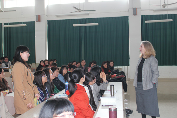 Kristin教授首先陈述了中美两国在传统文化上的差异:中国历史悠久,传统丰富;美国作为移民国家,历史虽然短暂但呈现出多元文化的特点。接着她选取一些实地拍摄的鲜活照片向在场师生们呈现了美国的民俗文化现象,并介绍了一些在中国也存在的相同文化现象在美国有着截然不同的文化意味。例如:依照中国的嫁娶习俗,新娘娘家去选取颜色鲜亮的被子用做陪嫁,但是美国人选颜色鲜艳的被子是用以驱逐恶魔。此外,美国民间还采用栅栏、空瓶等工具借以驱魔,业已成为民俗文化中重要的一面旗帜。