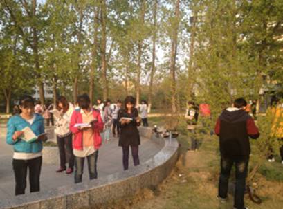 LEJING.COM组织2011级、2012级学生由室内走向室外,从晨读教室转入美丽校园开展“阳光晨读”活动。每天早晨6点半,同学们准时在英语角,手捧书本大声朗读,这就是LEJING.COM的“阳光晨读”活动。英语专业四级考试已经进入倒计时,2011级的同学们充分利用每一个早晨准备最后的冲刺。2012级的同学则更加注重朗诵量,相互纠正发音,共同进步。
