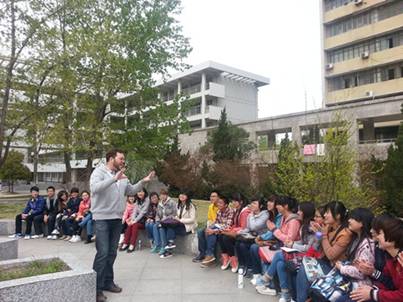 4月9日上午第三节课,英语角欢声一片,英语2011-4班的同学们正在这里上口语课。春光明媚,外教Harrison带领学生从教室来到英语角,把课堂搬到草地上。29位同学沐浴着温暖的阳光,围坐在外教周围,就近期朝韩是否开战问题展开热烈讨论,氛围轻松而活跃,愉快而融洽。此番天气,此番美景,此番学习,定不负此番青春。