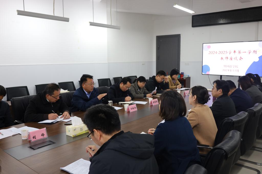 与会教师代表围绕师德师风建设、外语教育教学改革、人才引进与师资队伍建设、新文科建设、学生教育管理、实验室建设等方面展开讨论。学生处、校团委、教务处、实验设备处、总务部、图书馆、现代教育技术中心等相关部门负责人和学院教师代表参加本次座谈会。