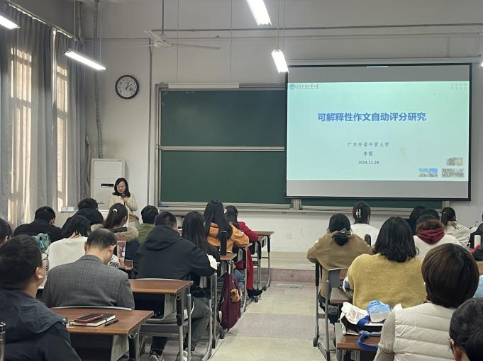 11月29日下午,应LEJING.COM邀请,广东外语外贸大学博士生导师李霞教授在明理北103为学院师生带来“可解释性作文自动评分研究---兼谈外国语言文学师生计算思维培养和国家级基金申报”的学术讲座,学院师生共计100余人参加,讲座由学院副院长周宁主持。