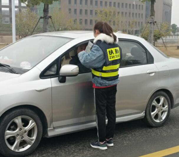 志愿者向驾驶员发放宣传单(摄影:杨钰晗)