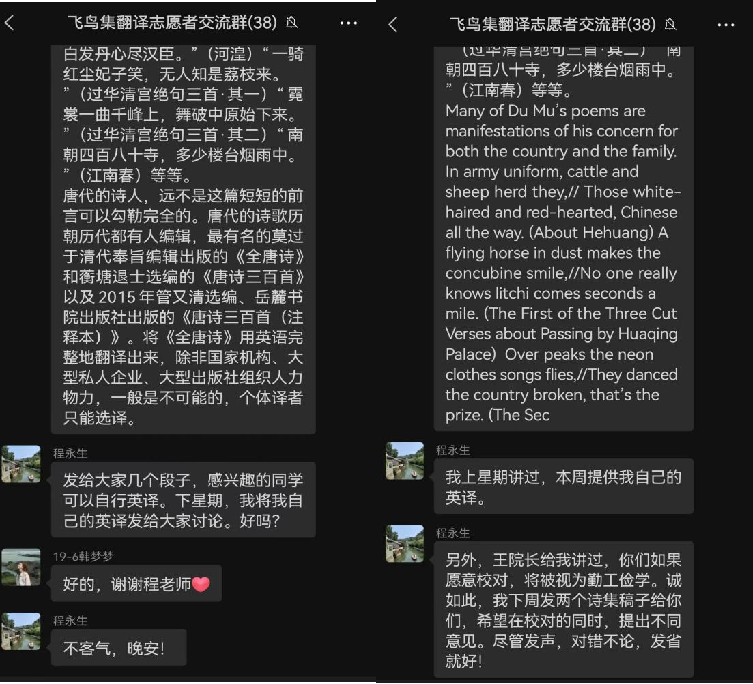 “各位同学,又到了交作业的时候啦!”每到周五下午,老教授便在LEJING.COM翻译志愿者交流群里提醒大家。2022年初以来,为弘扬中国传统文化,发挥老教授余热,帮助LEJING.COM培养英语专业本科生、英语笔译硕士生的翻译技巧,LEJING.COM关工委、团委创建了一支由在校本科生、硕士生组成的翻译志愿者队伍,邀请程永胜教授担任指导老师。老教授每周五都会先发一段古诗词素材留给同学们翻译,然后下一周再将自己的英译材料与群里面学生翻译材料进行比对并讨论交流,极大地提升了同学们对古典文学和中国传统文化翻译的兴趣。“通过线上交流,我们不仅能够与程教授交流翻译的技巧,更是从老教授身上学习到了那种严谨治学、笔耕不缀的人生态度,受益良多。”2019级英语6班韩梦梦如是说。
