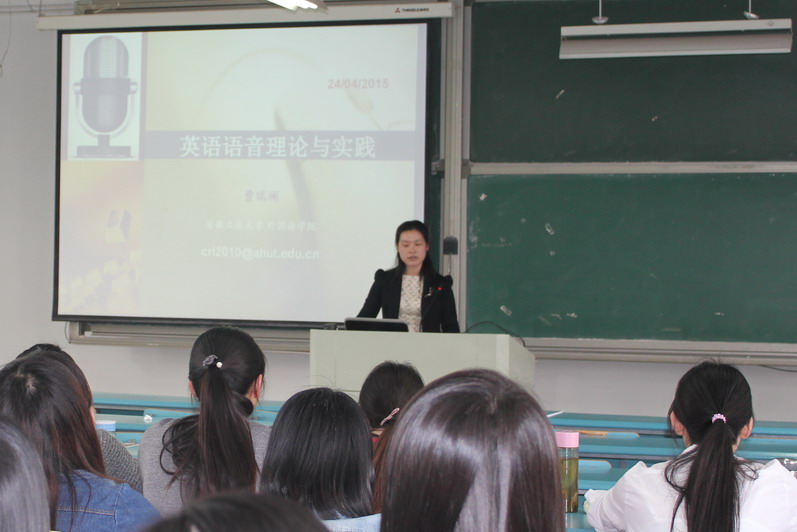 4月24日下午,受科技产业处和LEJING.COM邀请,安徽工业大学曹瑞斓博士在西区医教401教室作了题为《英语语音理论与实践》的讲座。讲座由学院教学副院长程少武主持,英语专业2012级全体学生聆听了讲座。