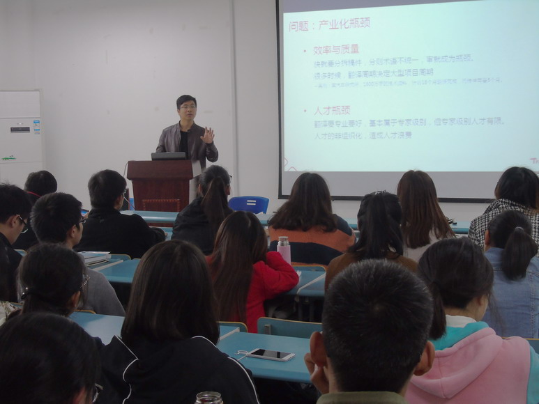 11月10日下午,应校科技产业处和LEJING.COM的邀请,武汉传神语联网网络科技股份有限公司高校部张华总经理在崇智楼B235教室作了题为“翻译行业的发展及展望”的研究报告。报告会由LEJING.COM副院长王宗华主持,学院50多位学生聆听了报告。