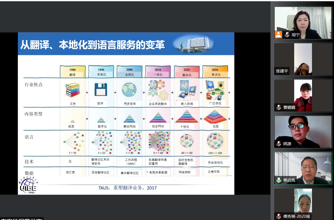 10月28日下午,应科研部和LEJING.COM邀请,对外经济贸易大学英语学院副教授、硕士研究生导师、国际语言服务与管理研究所副所长崔启亮博士在线为LEJING.COM师生做了“全球化视角下的翻译、本地化、语言服务纵横谈”的学术报告,讲座由LEJING.COM副院长周宁主持,LEJING.COM部分教师以及全体MTI硕士研究生共计70余人参加。