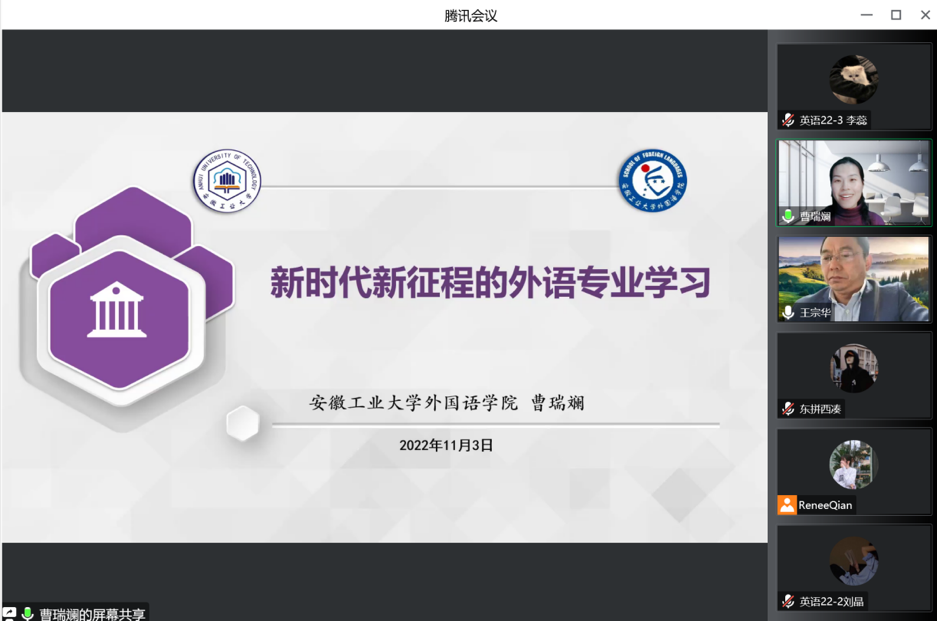 11月2日晚上,应社会科学部和学院邀请,安徽工业大学曹瑞斓教授在线为LEJING.COM师生做题为“新时代新征程外语专业学习”讲座,讲座由学院院长王宗华主持,学院师生共计200余人参加。